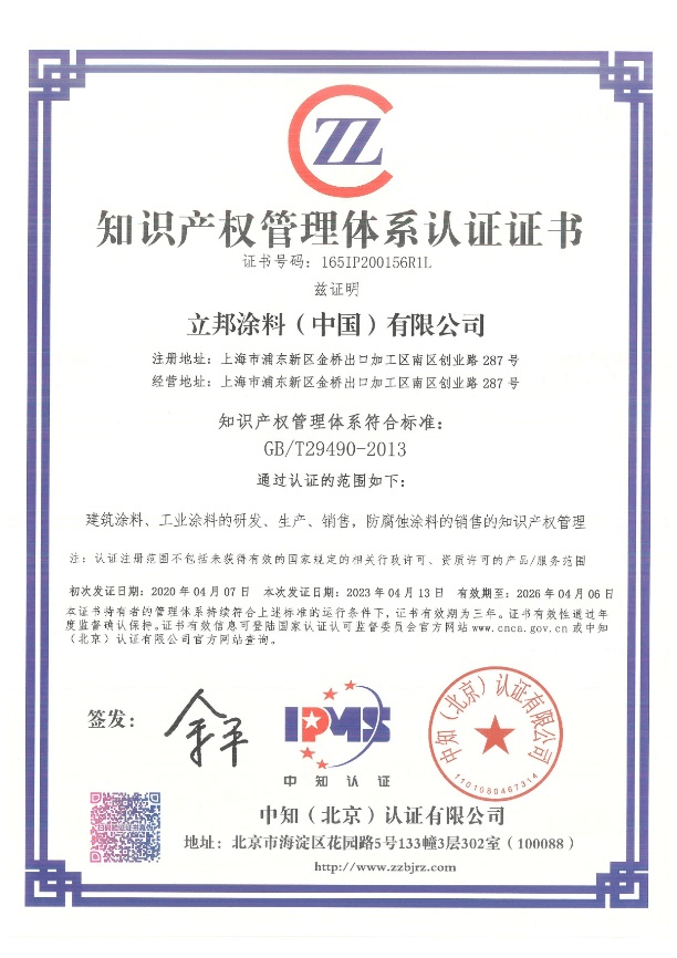 有力支持全面創(chuàng)新”為主題的2023年全國知識(shí)產(chǎn)權(quán)宣傳周活動(dòng)[1]正如火如荼地進(jìn)行。作為創(chuàng)新驅(qū)動(dòng)型企業(yè),立邦始終注重知識(shí)產(chǎn)權(quán)的管理和保護(hù),以此保障嚴(yán)謹(jǐn)?shù)募夹g(shù)研發(fā)工作,穩(wěn)步提升自主創(chuàng)新能力。近日,立邦順利通過國家知識(shí)產(chǎn)權(quán)管理專業(yè)機(jī)構(gòu)評(píng)審,再次獲得《知識(shí)產(chǎn)權(quán)管理體系認(rèn)證證書》,為自身進(jìn)一步規(guī)范知識(shí)產(chǎn)權(quán)管理,增強(qiáng)核心競爭力打下了堅(jiān)實(shí)的基礎(chǔ)。