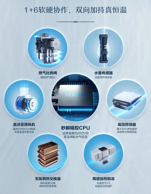 硬件上,【川】系列燃氣熱水器HT730搭載秒瞬精控CPU,內置全新升級的PID智能算法,可達6500萬/秒超速運算,精準計算水氣配比,使燃氣比例閥和水量傳感器快速響應,迅捷精控持久恒溫。水流量傳感器,可精準調節(jié)進出口水量,在CPU的配合下實現(xiàn)水溫恒定;燃氣比例閥,實時精控燃氣用量,高能效穩(wěn)定控溫;高效燃燒器,創(chuàng)新增氧V型火排,增大30%燃燒面積,增強89.68%燃燒效率,削弱15%運行噪音,分段穩(wěn)然技術讓小火中火大火靈活調控,實現(xiàn)35-60℃寬幅調溫。直流變頻風機,最高5000r/min轉速無極變速高效供氧充足。高效無氧銅熱交換器,除了導熱性耐腐蝕性出色,還具備更強的熱沖擊性能。陶瓷加熱防凍,當水溫低至5℃,四個陶瓷加熱器便會啟動加熱保護,無懼國內高寒天氣,-20℃也能安心熱浴。1+6的軟硬件協(xié)作,便可讓【川】系列燃氣熱水器HT730輸出澎湃熱水,給予你舒適的沐浴體驗與不間斷的溫暖關懷。