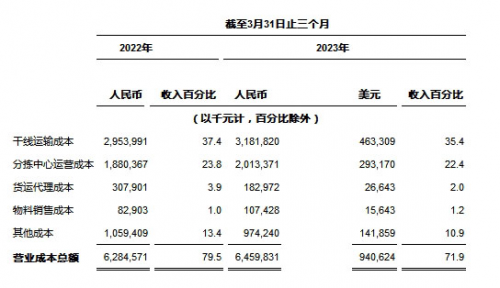 ?收入總額 為人民幣8,983.2百萬(wàn)元(1,308.1百萬(wàn)美元),較2022年同期的人民幣7,904.1百萬(wàn)元增長(zhǎng)13.7%。核心快遞服務(wù)收入較2022年同期增長(zhǎng)16.1%,該增長(zhǎng)是由于包裹量增長(zhǎng)20.5%及單票價(jià)格下降3.7%的綜合影響所致。貨運(yùn)代理服務(wù)收入較2022年同期減少41.8%,該減少主要是由于全球經(jīng)濟(jì)疲弱導(dǎo)致跨境電商需求和定價(jià)下降所致。物料銷(xiāo)售收入主要由打印電子面單所需的熱敏紙銷(xiāo)售收入組成,同比增長(zhǎng)30.8%,該等增長(zhǎng)與包裹量增長(zhǎng)趨勢(shì)吻合。其他收入主要由金融貸款業(yè)務(wù)組成。