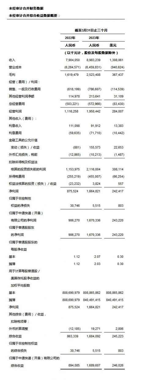 中國(guó)行業(yè)領(lǐng)先且快速成長(zhǎng)的快遞公司中通快遞(開(kāi)曼)有限公司(紐交所代碼:ZTO及香港聯(lián)交所代號(hào):2057) (「中通」或「本公司」)今天公布其截至2023年3月31日止第一季度的未經(jīng)審計(jì)財(cái)務(wù)業(yè)績(jī)[1]。本公司的包裹量同比增長(zhǎng)20.5%,市場(chǎng)份額擴(kuò)大1.8個(gè)百分點(diǎn)至23.4%,同時(shí)也保持了優(yōu)質(zhì)的服務(wù)及客戶(hù)滿(mǎn)意度。調(diào)整后凈利潤(rùn)[2]增長(zhǎng)82.1%至人民幣1,919.8百萬(wàn)元,經(jīng)營(yíng)活動(dòng)產(chǎn)生的現(xiàn)金流為人民幣2,738.0百萬(wàn)元。