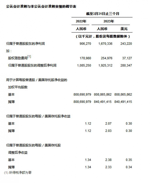 ? 基本及攤薄每股美國(guó)存托股(「美國(guó)存托股」[4])凈收益為人民幣2.07元(0.30美元)及人民幣2.03元(0.30美元),較2022年同期的人民幣1.12元及人民幣1.12元分別增長(zhǎng)84.8%及81.3%。