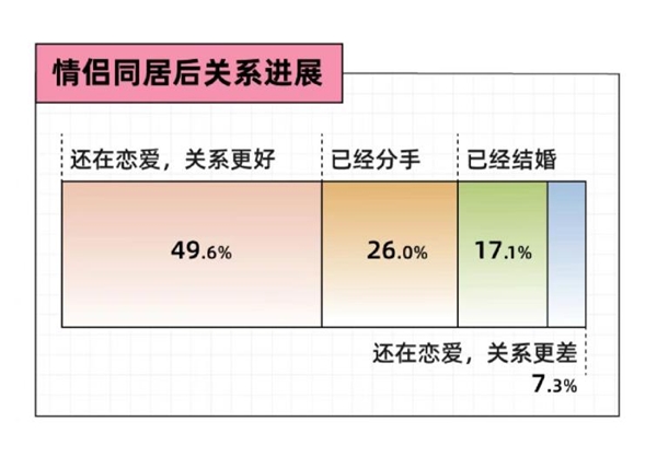 “同居分離會產(chǎn)生焦慮癥嗎”“試婚同居生子男方棄養(yǎng)”“同居該不該AA”……微博熱搜榜上,同居始終是一大熱門爭議話題。當熱戀期的完美形象分崩離析,留給同居的年輕人的,是否只是一地雞毛?實際上,《報告》顯示,多數(shù)同居關(guān)系有著美好結(jié)局。