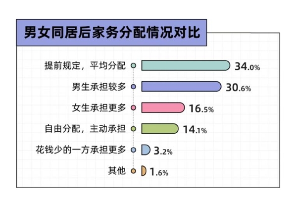 令人意外的是,《報告》顯示,“男生承擔(dān)更多家務(wù)”的比例為30.6%,高于女生(16.5%),完全顛覆了刻板認知。此前的一項調(diào)查也顯示,同居后,男生們的“居家能力”大幅提升,提升幅度甚至超過女生,不過在結(jié)婚后又會有所下降。