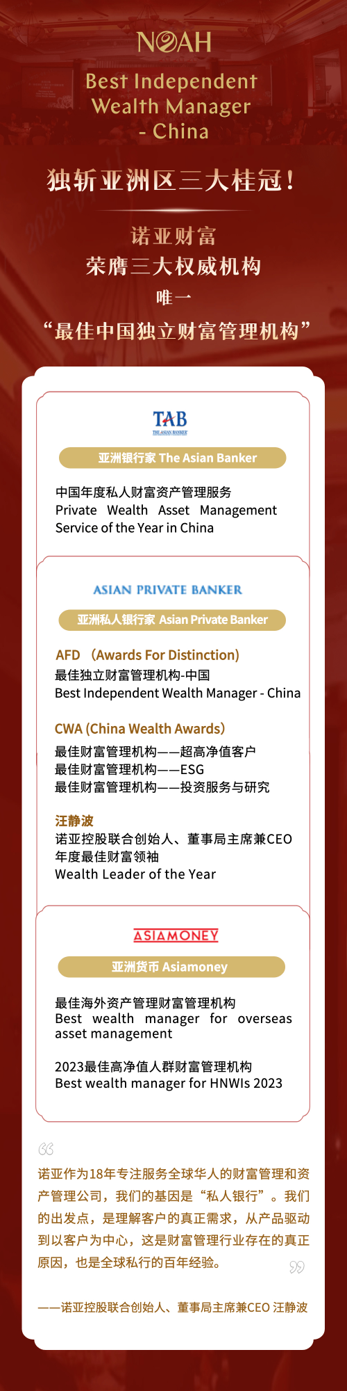 3月27日,諾亞財(cái)富在第五屆《亞洲私人銀行家》(Asian Private Banker)中國(guó)財(cái)富獎(jiǎng)(China Wealth Awards)評(píng)選中斬獲四大榮譽(yù)的優(yōu)異成績(jī),在“超高凈值客戶”、“ESG”、“投資服務(wù)與研究”和“年度最佳財(cái)富領(lǐng)袖”個(gè)人成就獲得權(quán)威認(rèn)可。在此前的3月8日,諾亞亦作為中國(guó)區(qū)唯一獲獎(jiǎng)財(cái)富管理公司榮獲《亞洲私人銀行家》亞洲區(qū)“2022中國(guó)最佳獨(dú)立財(cái)富管理機(jī)構(gòu)”,受邀與法國(guó)巴黎銀行、摩根私人銀行、匯豐銀行、花旗銀行、瑞士信貸銀行、澳大利亞國(guó)民銀行、國(guó)泰世華等國(guó)際私人銀行及財(cái)富管理標(biāo)桿一同出席于中國(guó)香港舉辦的盛典,也是諾亞財(cái)富第六年獲得亞洲私人銀行家的多項(xiàng)認(rèn)可。