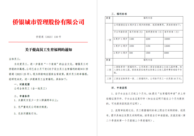 近日,一份僑銀股份新出臺的《關于提高員工生育福利的通知》流出,瞬間爆火全網引發(fā)熱議,網友紛紛大呼“神仙公司還招人嗎?”“報上地址,讓我來!”