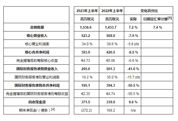 所有財務數(shù)據(jù)均以百萬歐元(€m)為單位。除非另有說明,本報告的業(yè)績涵蓋2023年6月30日之前的6個月期間(2023年上半年)和2023年6月30日之前的3個月期間(2023年第二季度),而進行數(shù)據(jù)對比的對象為2022年6月30日之前的6個月期間(2022年上半年)和2022年6月30日之前的3個月期間(2022年第二季度)。除非另有說明,否則評論基于2023年上半年的業(yè)績。所有評論和較之前業(yè)績的比較均不包括2022年7月剝離的多元健康(CHC)業(yè)務的業(yè)績。
