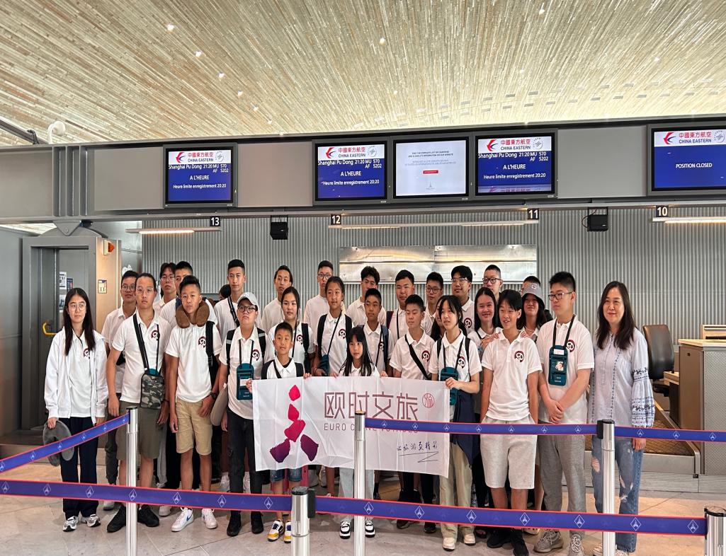 夏令營全體成員在巴黎戴高樂國際機場集結(jié)出發(fā)。