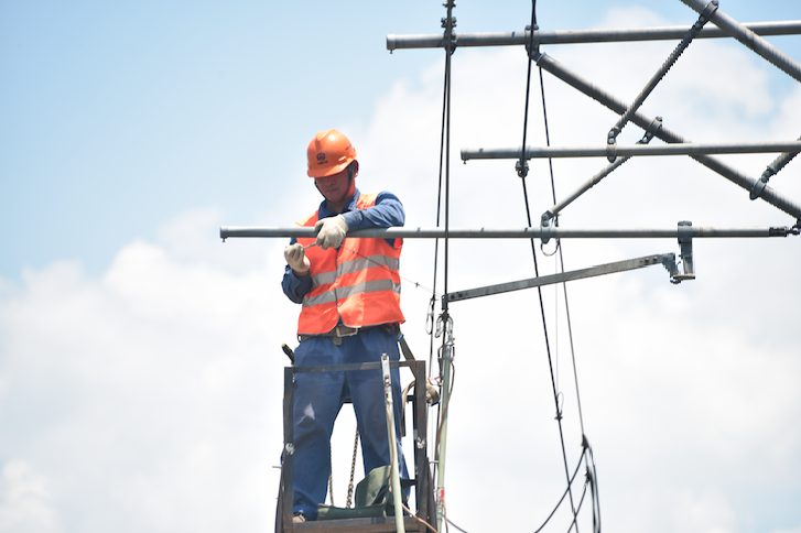 終于等到車梯豎起來,“扶好車梯!”剛囑咐好輔助人員,劉冉就帶著小李竄到了車梯上,現(xiàn)在的他只想早點干完活,早點休息??蓜傞_始干活沒一會,劉冉看著腕臂上動作又慢又變扭的小李就來了脾氣,“墨跡什么呢,身體貼在腕臂上干,搞快點!”“劉工,主要是這腕臂太燙了?!毙±詈芪慕忉尩馈2还饩€路上熱,此時支柱上的金屬設(shè)備因為曬了一上午,溫度已經(jīng)超過50℃,帶著手套還感覺不出來,但隔著一層薄衣服的話就燙的難受。“你站車梯框里干,我過去。”看到設(shè)備溫度都這么高,此時的劉冉更擔(dān)心大家的身體,可千萬別中暑了啊。