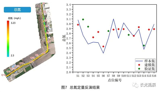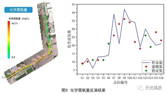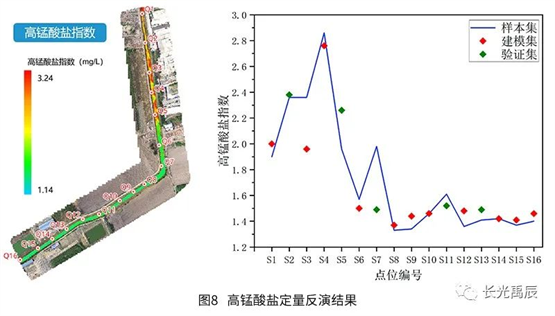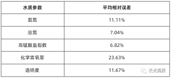 精度評(píng)定結(jié)果見(jiàn)表2.各水質(zhì)參數(shù)的平均相對(duì)誤差均在25%以下,可滿(mǎn)足常態(tài)化、高頻次的全局水質(zhì)檢測(cè)需求?;瘜W(xué)需氧量反演誤差稍大是因?yàn)樵摋l河道整體水質(zhì)情況存在較大的空間異質(zhì)性,河道不同河段中有機(jī)物含量差異較大,而水體化學(xué)需氧量與有機(jī)物濃度密切相關(guān),所以這種變化較快的梯度可能會(huì)引入一定的誤差,模型也有繼續(xù)優(yōu)化的空間。