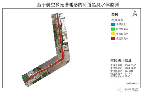 黑臭水體是指水質(zhì)污染嚴(yán)重、水體顏色異常、散發(fā)惡臭的情況。它通常由生活污水、工業(yè)廢水和農(nóng)業(yè)排放物等引起,造成環(huán)境破壞和健康風(fēng)險(xiǎn)。通過(guò)無(wú)人機(jī)多光譜遙感技術(shù),結(jié)合水色與實(shí)測(cè)水質(zhì)參數(shù)數(shù)據(jù)的分析,對(duì)本次實(shí)驗(yàn)河道黑臭水污染的識(shí)別情況如圖5所示。