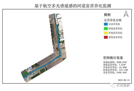 水體富營(yíng)養(yǎng)化是指水中營(yíng)養(yǎng)物質(zhì)(如氮、磷)過(guò)度積累,導(dǎo)致水體中藻類(lèi)、水生植物大量繁殖的現(xiàn)象。水體富營(yíng)養(yǎng)化會(huì)造成藻類(lèi)過(guò)度生長(zhǎng),破壞水生態(tài)系統(tǒng)的平衡,甚至引發(fā)水體死亡。通過(guò)無(wú)人機(jī)多光譜遙感技術(shù),結(jié)合實(shí)測(cè)水質(zhì)參數(shù)數(shù)據(jù)的分析,對(duì)本次實(shí)驗(yàn)河道水體富營(yíng)養(yǎng)化的識(shí)別情況如圖4所示。