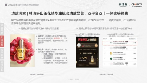 根據(jù)第一財(cái)經(jīng)商業(yè)數(shù)據(jù)中心的發(fā)布《2023油類精華消費(fèi)趨勢(shì)洞察報(bào)告》 中指出,精華油、以油養(yǎng)膚,以及"抗老精華油"的概念在小紅書(shū)、抖音等社交平臺(tái)的搜索指數(shù)不斷攀升,小紅書(shū)上"以油養(yǎng)膚"話題的瀏覽總量超過(guò)了1.2億,過(guò)去一年線上淘寶天貓及京東平臺(tái)精華油銷售額同比增速達(dá)64%。在國(guó)內(nèi)外品牌紛紛跟進(jìn)推出油類護(hù)膚產(chǎn)品之際,林清軒憑借山茶花油的提前布局,借勢(shì)快速進(jìn)入爆發(fā)期。