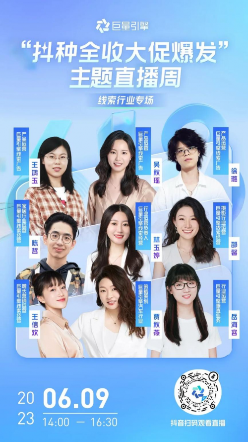 關(guān)注“巨量引擎小助手”抖音號(hào),6月9日14:00,來(lái)線(xiàn)索行業(yè)618直播專(zhuān)場(chǎng),了解更多活動(dòng)政策及作戰(zhàn)攻略。