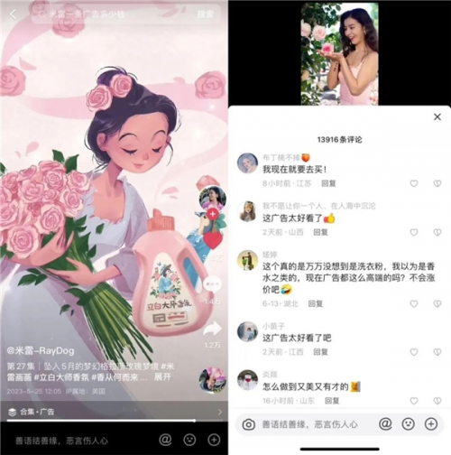 這條視頻中,一位身穿連衣裙的漫畫少女,抱著一大束粉色玫瑰花,轉(zhuǎn)眼間漫畫中的女孩就成為了真人博主,整個視頻中充滿了浪漫夢幻的少女情懷。“每張都適合做壁紙”“不自覺的上揚嘴角”......大家對這條內(nèi)容豐富的商業(yè)推廣視頻,表現(xiàn)出了極強的寬容度,甚至連連贊賞。