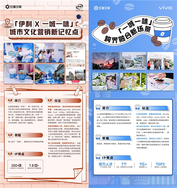 在垂類營銷層面,抖音生活服務(wù)打造《一城一味》IP,分別聯(lián)合vivo、伊利開展跨界營銷,借由上海咖啡文化周及“咖啡市”的城市文化名片,通過線上種草、線下聚合客流打卡體驗(yàn)的方式,將品牌新品融入用戶高頻生活場景,有力強(qiáng)化上海本地消費(fèi)者對新品的認(rèn)知。