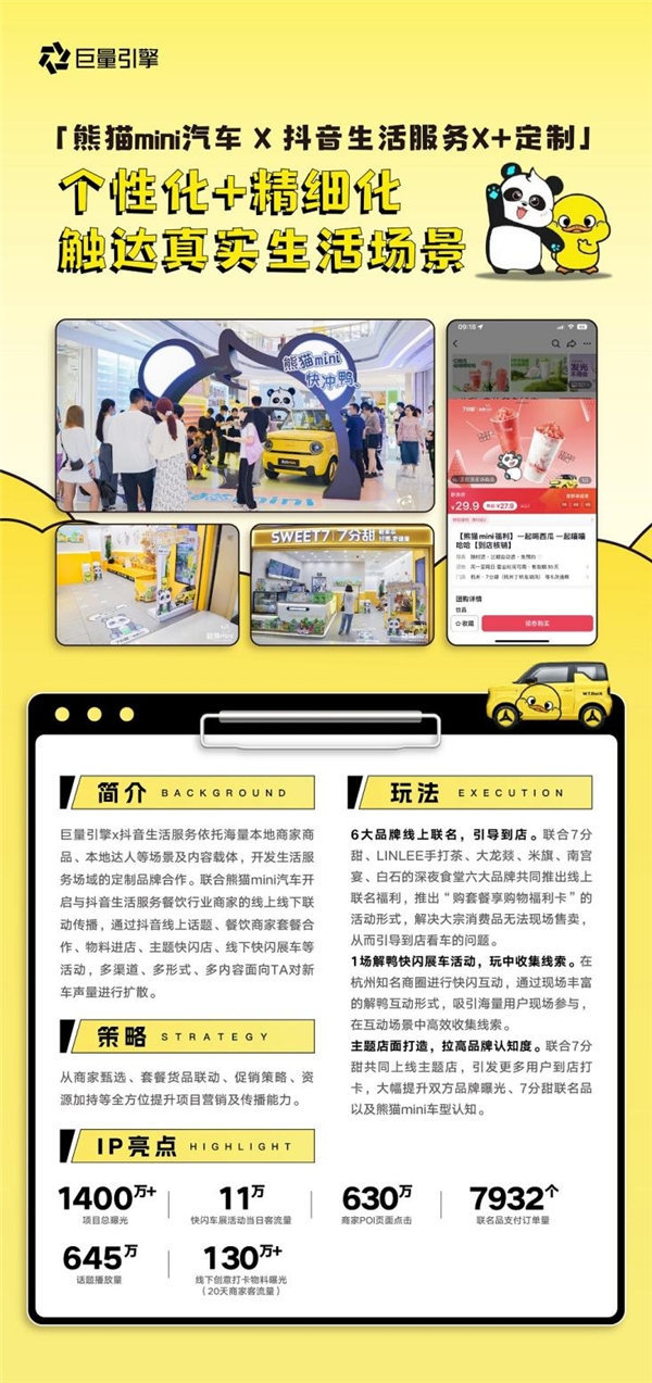 針對線索獲取成本高、轉(zhuǎn)化鏈路長等痛點(diǎn),抖音生活服務(wù)聯(lián)手熊貓mini,攜手七分甜、LINLEE手打茶等六大品牌打造聯(lián)名福利,并在核銷等生活場景中植入新車,既擴(kuò)散新車聲量,又高效收集高意向線索。