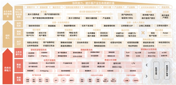 上圖為數(shù)字化經(jīng)營能力全景圖,最上層為全生命周期經(jīng)營規(guī)劃,即 AUM&MAU 雙軌經(jīng)營體系,包括不同階段的主要運營目標,如新手期主要為用卡習慣養(yǎng)成、用戶價值快速識別、新戶首面后離店經(jīng)營繼承等。