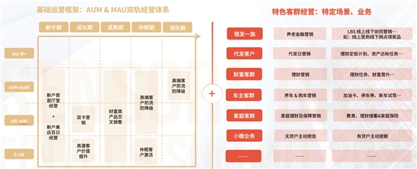 在 MAU + AUM 雙軌客群經(jīng)營模式下,接入特色客群、業(yè)務(wù)條線的經(jīng)營體系,進行經(jīng)營策略補碼,完善經(jīng)營策略體系,使得線上經(jīng)營更加立體。MAU + AUM 雙軌客群經(jīng)營模式在基礎(chǔ)運營框架體系中增加了“生命周期”的維度,生命周期是培育客戶的過程。金融機構(gòu)還可以在基礎(chǔ)框架上根據(jù)特定的業(yè)務(wù)場景和主題,制定相應(yīng)的經(jīng)營策略。