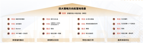 ? 業(yè)務(wù)策略:匹配業(yè)務(wù)特點和經(jīng)營目標的經(jīng)營策略體系,不同業(yè)態(tài)的業(yè)務(wù)策略和場景不同,可嘗試創(chuàng)新的點也不同;匹配業(yè)務(wù)與客群特點的渠道定位和場景建設(shè)