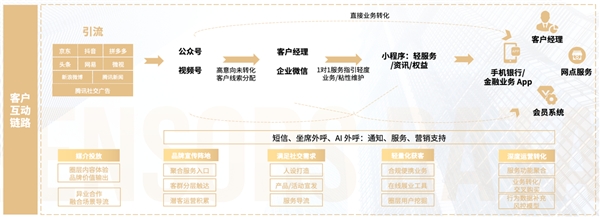 金融企業(yè)在客戶全鏈路互動與經(jīng)營上,涉及到的渠道觸點也比較多。通常,在引流階段,客戶通過交易型 App、資訊類 App、種草媒體等進行互動,之后進入公眾號、視頻號為主的公私域轉(zhuǎn)換的形態(tài),如果轉(zhuǎn)化周期較長,還會通過客戶經(jīng)理和企業(yè)微信進行 1V1 服務(wù)引導和關(guān)系維護,還可以直接導量到小程序或 H5 進行輕轉(zhuǎn)化,以及到手機銀行、金融業(yè)務(wù) App,結(jié)合客戶經(jīng)理、網(wǎng)點服務(wù)和會員系統(tǒng)加強后鏈路深度運營。