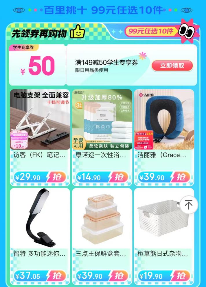 為了讓學生們省錢煥新,京東開學季特設“百里挑十 ”專區(qū),雜物收納籃、筆記本電腦支架、泡腳盆、毛巾、水果刀、除螨噴霧等剛需好物99元任選10件,更有搬家打包收納袋、真空壓縮包、抽屜式桌面收納盒、衣服收納筐等海量商品享低至5折的學生折扣,為學生們帶來超值優(yōu)惠。