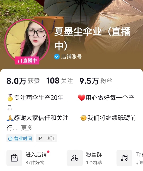 當(dāng)自家店鋪成為網(wǎng)紅店,讓沒(méi)做電商的鐘永平有了新的想法。于是,在2020年5月,他決定入局抖音,并取名“夏墨塵傘業(yè)”。