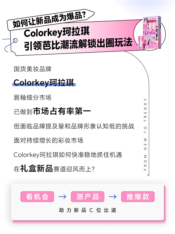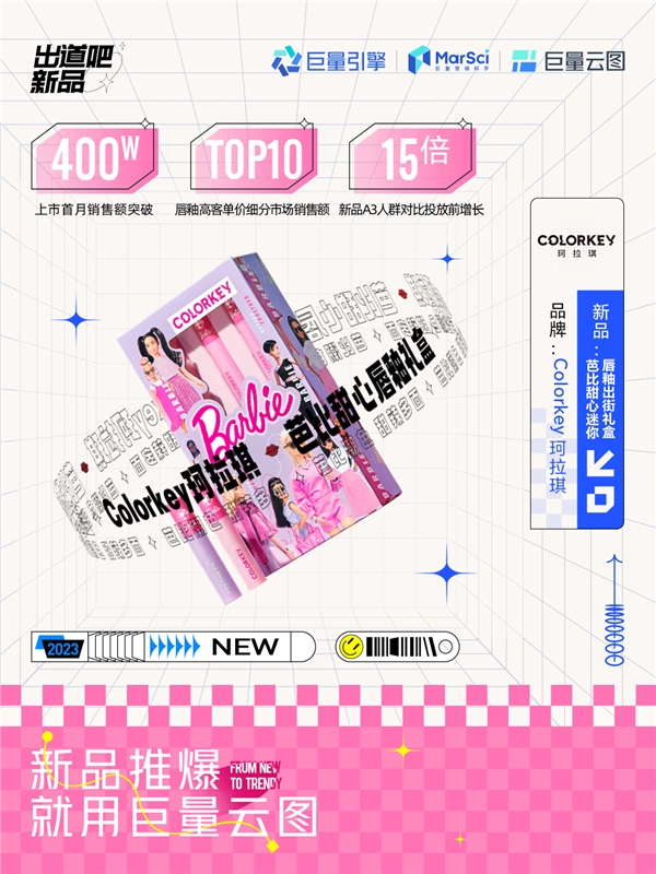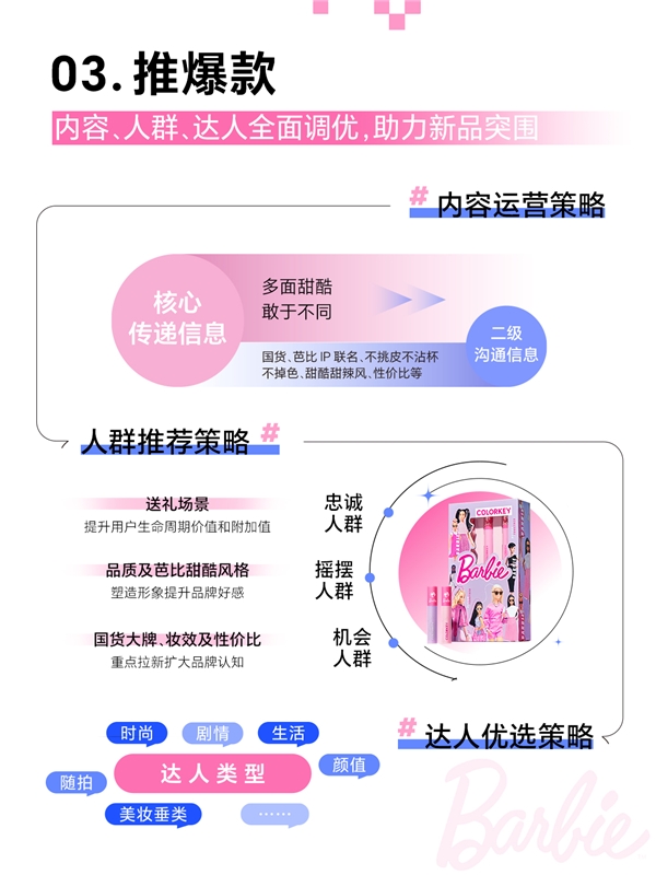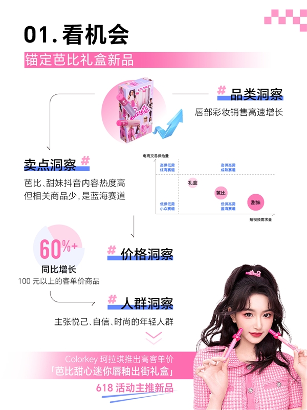 適用于送禮、提升品牌調(diào)性、具有高客單價特征的“芭比禮盒”新品,符合品牌風(fēng)格特點和消費需求,適宜作為品牌形象款進行主推和破圈?;诖?珂拉琪打造高客單價“芭比甜心迷你唇釉出街禮盒”作為618活動的主推新品,強力吸引目標(biāo)人群。