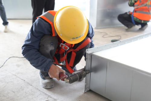 本次競賽分為風(fēng)管加工及安裝、支架焊接兩項(xiàng)分項(xiàng)競賽。在風(fēng)管加工及安裝分項(xiàng)競賽中,評委組選取防排煙系統(tǒng)分支三通作為競賽內(nèi)容,提供風(fēng)管三通半成品部件,參賽工人結(jié)合原設(shè)計(jì)圖紙,開展風(fēng)管合口、法蘭鉚接及風(fēng)管安裝作業(yè)。在支架焊接分項(xiàng)競賽中,評委組選取統(tǒng)一的綜合支架,繪制大樣圖,提供相關(guān)工具及材料,參賽人員按照圖紙下料、焊接并完成綜合支架施工。