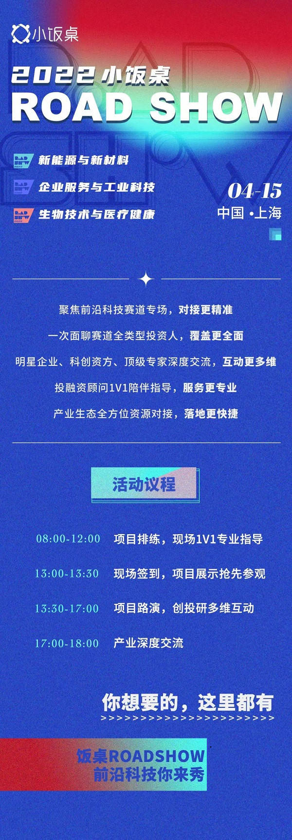 導語:4月15日,2022小飯桌ROASHOW將登陸上海,將開設(shè)“新能源與新材料”、“企業(yè)服務(wù)與工業(yè)科技”、“生物技術(shù)與醫(yī)療健康”賽道專場路演,歡迎各位優(yōu)秀的科技創(chuàng)業(yè)者前來應(yīng)戰(zhàn)!