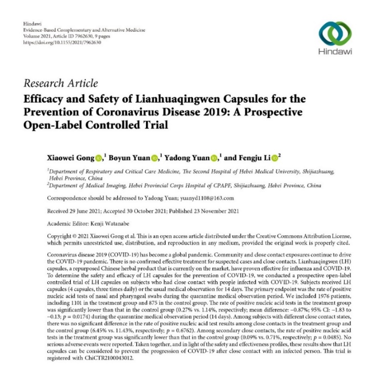 由河北醫(yī)科大學第二醫(yī)院呼吸與危重癥醫(yī)學二科主任袁雅冬教授主持開展的“連花清瘟膠囊預防新型冠狀病毒肺炎”真實世界研究論文被國際學術期刊《循證補充和替代醫(yī)學》刊發(fā),該研究選取1976例與新冠肺炎感染者有密切接觸的受試者,分為連花清瘟治療組(1101例)和對照組(875例),兩組受試者分別接受連花清瘟膠囊(4粒/次,3次/天)治療和常規(guī)醫(yī)學14天觀察,并于14天后檢測鼻咽拭子核酸檢測陽性率。研究結(jié)果顯示,隔離醫(yī)學觀察期間(14天)治療組核酸檢測陽性率為0.27%,對照組為1.14%;二次密切接觸者中,治療組核酸檢測陽性率為0.09%,對照組為0.71%。服用連花清瘟治療組都顯著低于對照組。在醫(yī)學隔離觀察期間,對于核酸檢測陽性患者,連花清瘟治療組的癥狀發(fā)生率顯著低于對照組,特別是能顯著降低發(fā)熱的發(fā)生率。這是首個對新冠密切接觸者預防的有效性和安全性的臨床試驗。