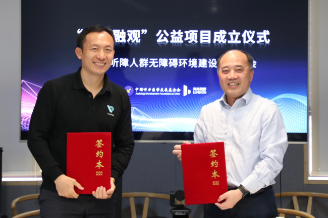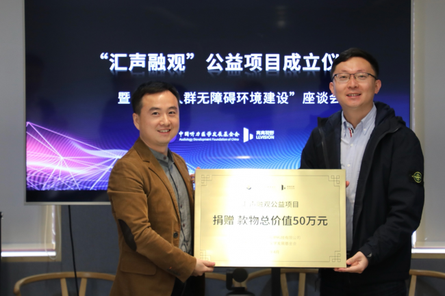 中國聽力醫(yī)學(xué)發(fā)展基金會常務(wù)副理事長兼秘書長公澤忠(右)同北京亮亮視野科技有限公司首席運(yùn)營官婁身強(qiáng)(左)共同完成公益項(xiàng)目的捐贈儀式