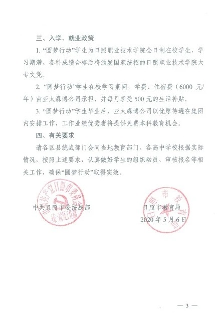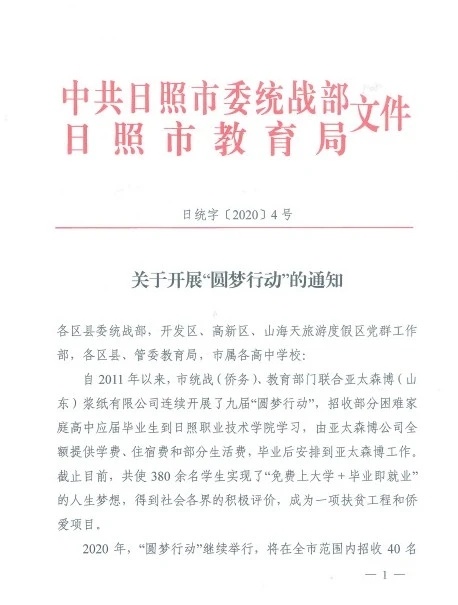 2011年,亞太森博與統(tǒng)戰(zhàn)部門合作開(kāi)展的“圓夢(mèng)行動(dòng)”正式啟動(dòng)。亞太森博出資,統(tǒng)戰(zhàn)協(xié)調(diào)教育部門出政策,與大學(xué)合作,為考上大學(xué)的家庭貧困高中生解決學(xué)費(fèi)、生活費(fèi),圓夢(mèng)大學(xué)。
