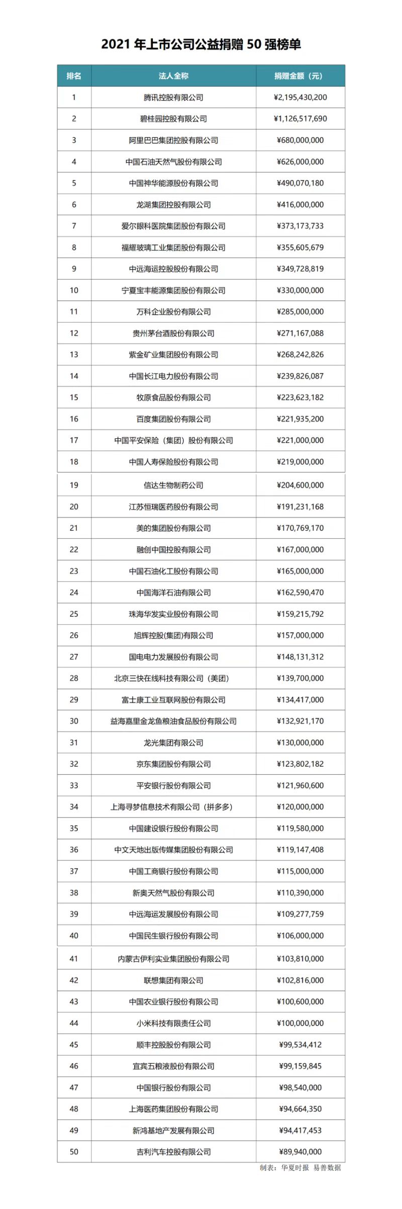《報告》公布了2021年上市公司公益捐贈50強榜單。