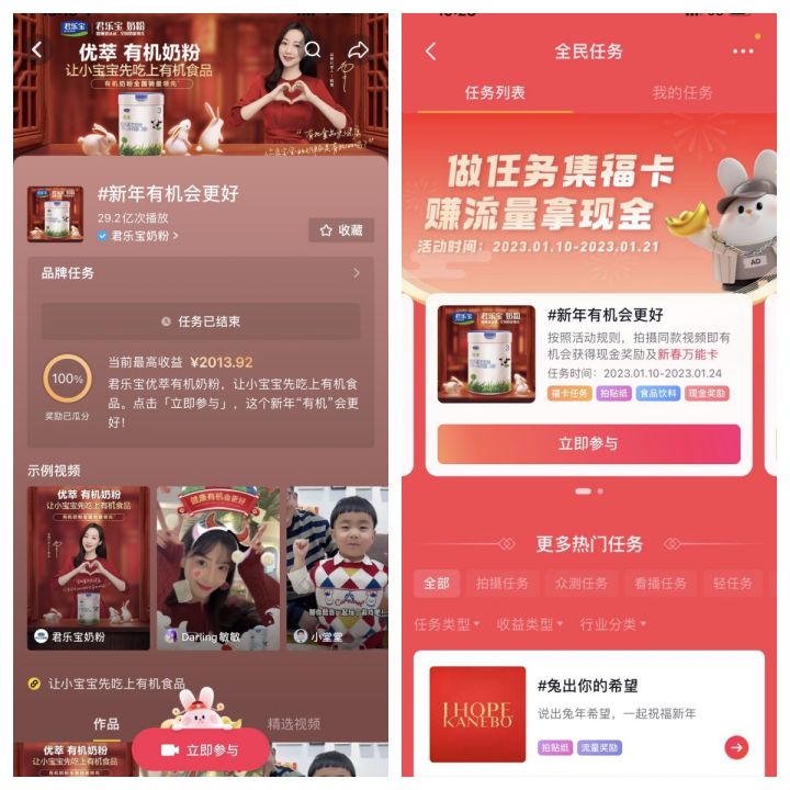 基于新一代母嬰人群所追求沉浸感和參與感,信賴場(chǎng)景式安利、沉浸式感受,因而優(yōu)萃有機(jī)奶粉攜手巨量引擎在基礎(chǔ)品牌信息的純曝光宣傳之外,共創(chuàng)了一系列多元互動(dòng)玩法,如找紅包、集節(jié)氣卡、挑戰(zhàn)賽貼紙等,在點(diǎn)燃新春氛圍的同時(shí)加深了品牌與用戶深度互動(dòng),尤其是在抖音上發(fā)起的 #新年有機(jī)會(huì)更好 的話題挑戰(zhàn)賽,優(yōu)萃有機(jī)奶粉的有機(jī)賣點(diǎn)持續(xù)多次露出,活動(dòng)各頁面上“優(yōu)萃有機(jī)奶粉,讓小寶寶先吃上有機(jī)食品”高度吸睛,最大程度覆蓋了用戶的目光所及之處,高密度投放且集中化曝光使得優(yōu)萃有機(jī)奶粉品牌價(jià)值理念在用戶心智中形成深刻記憶點(diǎn)。