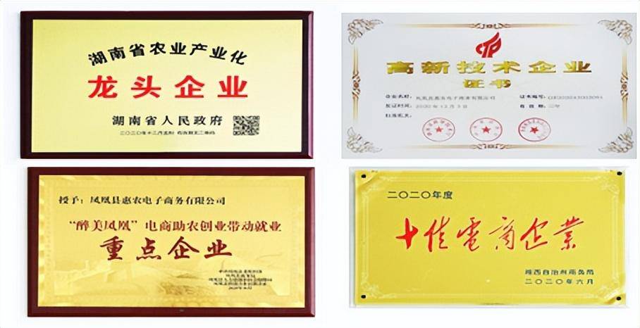 2020 年, 公司獲得湖南省農(nóng)業(yè)龍頭企業(yè) 、湖南省電子商務(wù)企業(yè)、湖南省高新技術(shù)企業(yè)、鳳凰縣電商消費(fèi)扶貧新技術(shù)企業(yè)、鳳凰縣電商消費(fèi)扶貧示范企業(yè)、鳳凰縣電商助農(nóng)就業(yè)帶動(dòng)重點(diǎn)企業(yè)、湘西州十佳電商企業(yè)等榮譽(yù)稱號。