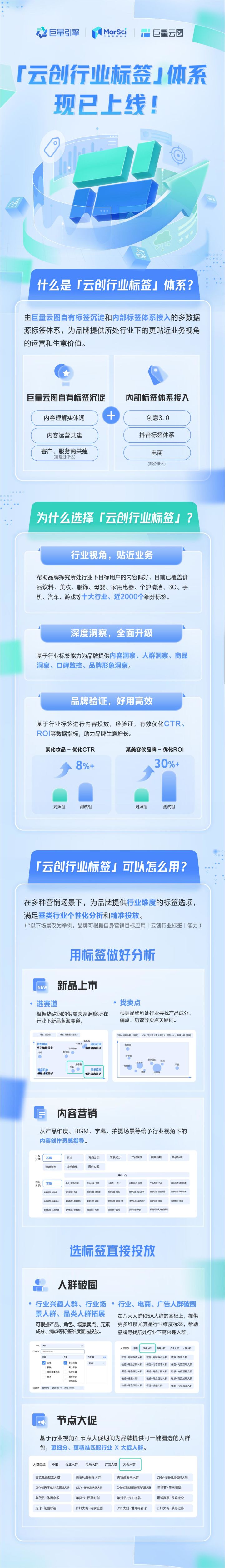 針對(duì)這些痛點(diǎn),巨量云圖特別推出「云創(chuàng)行業(yè)標(biāo)簽」底層標(biāo)簽?zāi)芰?#xff0c;在不斷沉淀巨量云圖自有標(biāo)簽的基礎(chǔ)上,同時(shí)接入內(nèi)部標(biāo)簽體系,通過多方造血豐富標(biāo)簽顆粒度,滿足行業(yè)需求。它從底層打通了平臺(tái)多數(shù)據(jù)源,提供了更細(xì)致、更下鉆、更多維的洞察分析和精準(zhǔn)投放能力。