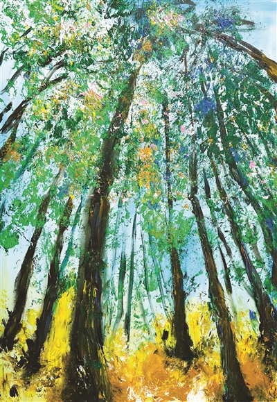 吳冠中老先生曾說(shuō),中國(guó)畫(huà)不能“近親結(jié)婚”。因?yàn)槲覀兊囊曇蔼M窄。藝術(shù)是相通的,不分東方和西方。因此,劉家男不斷吸收東西方精華,并運(yùn)用于作品之中。她的作品既能呈現(xiàn)出西方作品的色彩美感,同時(shí)又兼具中國(guó)潑墨的畫(huà)面呈現(xiàn)。無(wú)論是胡楊林系列,還是天端系列、鯨落系列以及自然系列,其作品的整體色彩都是非常大膽的,給人以強(qiáng)烈的視覺(jué)沖擊。劉家男認(rèn)為,這是一個(gè)藝術(shù)家應(yīng)有的標(biāo)志性符號(hào)。