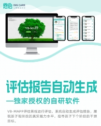 評估環(huán)節(jié) 評估報告自動生成!使用獨家授權(quán)的自研軟件——VB-MAPP評估系統(tǒng)進(jìn)行評估,系統(tǒng)自動生成評估報告,展現(xiàn)孩子現(xiàn)階段的真實能力水平,指導(dǎo)孩子下個階段的干預(yù)目標(biāo)。