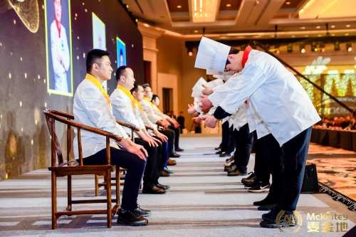 麥金地是一家先建立文化體系再建立管理體系的公司,以尊師重道、廚藝傳承傳承為宗旨創(chuàng)立“廚藝促進會”,以“仁義禮智信”儒家文化為底蘊組建【麥金地精忠俱樂部】管理團隊,是麥金地集團一貫堅持的管理措施。會議第一章,舉行了廚藝促進會拜師儀式和精忠俱樂部入會儀式。