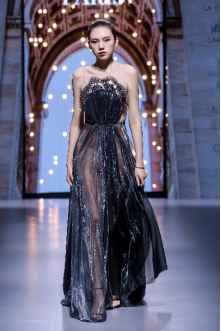 在充滿異域風(fēng)情的“巴爾米拉女王”主題發(fā)布中,法國高定女裝設(shè)計師JadAdam攜手紹興永耀紡織品有限公司、紹興晶遠(yuǎn)創(chuàng)意設(shè)計有限公司展現(xiàn)了尋找內(nèi)心平靜的啟蒙之旅的獨(dú)特過程。設(shè)計師從柯橋優(yōu)秀的面料中獲得啟發(fā),在華麗的禮服裙中采用了大量的刺繡及繡片繡珠工藝。兩家企業(yè)提供的閃光高密度歐根紗、銀色金屬絲、清透網(wǎng)眼等面料,花型立體簡潔、色彩透亮多變,為設(shè)計師帶來了豐富的靈感。從晚禮服、婚紗到高級時裝,JadAdam通過特有的藝術(shù)表現(xiàn)手法詮釋了本次禮服設(shè)計。