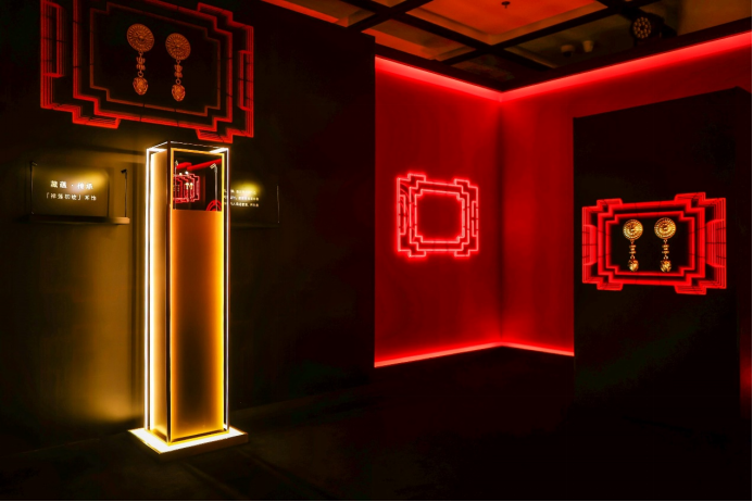 博大精深的中國(guó)傳統(tǒng)文化孕育出無(wú)限創(chuàng)造力和想象力,因此周大福珠寶集團(tuán)在探索珠寶美學(xué)與中國(guó)傳統(tǒng)文化相結(jié)合的過(guò)程中不斷推陳出新,呈獻(xiàn)許多匠心獨(dú)運(yùn)的藝術(shù)臻品——標(biāo)志性的周大福傳承系列作品。此次GOLD IS CHIC鎏光時(shí)代·周大福傳承系列黃金美學(xué)藝術(shù)展跨越時(shí)空界限,將蘊(yùn)含歷史、文化的黃金美學(xué)呈現(xiàn)到大眾視野中,全方面展現(xiàn)黃金珠寶設(shè)計(jì)背后的時(shí)尚創(chuàng)意靈感、精益求精的工藝和具有東方韻味的藝術(shù)美學(xué)理念。此次展覽的空間設(shè)計(jì)從周大福傳承系列視覺(jué)大片中汲取靈感,衍生出紅黑金三色、光影不斷變換、又極富想象力的三個(gè)空間,以創(chuàng)新的藝術(shù)視角展現(xiàn)品牌具有中國(guó)傳統(tǒng)文化內(nèi)涵的時(shí)尚潮流形象。置身于展覽空間,映入眼簾的是霓虹線條與迷離燈光相互交織而成的“時(shí)光隧道”,使人仿佛置身于過(guò)去與未來(lái)的交界地。光影流動(dòng)的變幻間,映照出品牌歷經(jīng)歲月沉淀后的璀璨輝煌,這意味著品牌正開(kāi)啟黃金世代的嶄新篇章。