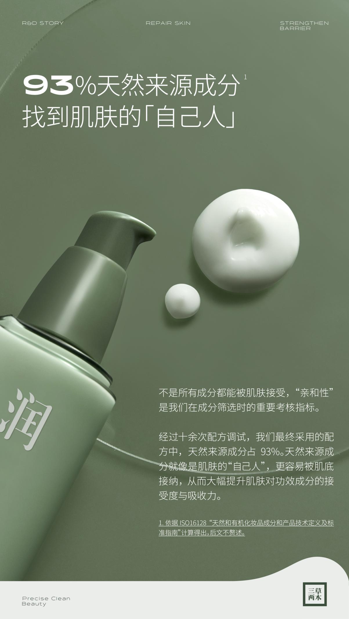 分膚定制專屬方案的搭建同樣離不開活性成分的精準(zhǔn)篩選。為了幫助消費(fèi)者深度潤澤肌膚,三草兩木選取崖壁上的潤活精粹——鐵皮石斛提取物,用自然之力降噪保濕,令肌膚水潤、嫩滑、透亮;4D透明質(zhì)酸鈉+PENTAVITIN?鎖水磁石的強(qiáng)力組合能夠有效鎖住游離水,幫助調(diào)控皮膚的含水量,進(jìn)一步滋潤、光滑、細(xì)膩皮膚。更讓人驚喜的是,在三草兩木經(jīng)由十余次調(diào)試敲定的最終配方中,93%的成分都是天然來源,而且不添加任何對皮膚有風(fēng)險(xiǎn)的成分,敏感肌膚使用也完全沒有負(fù)擔(dān)。